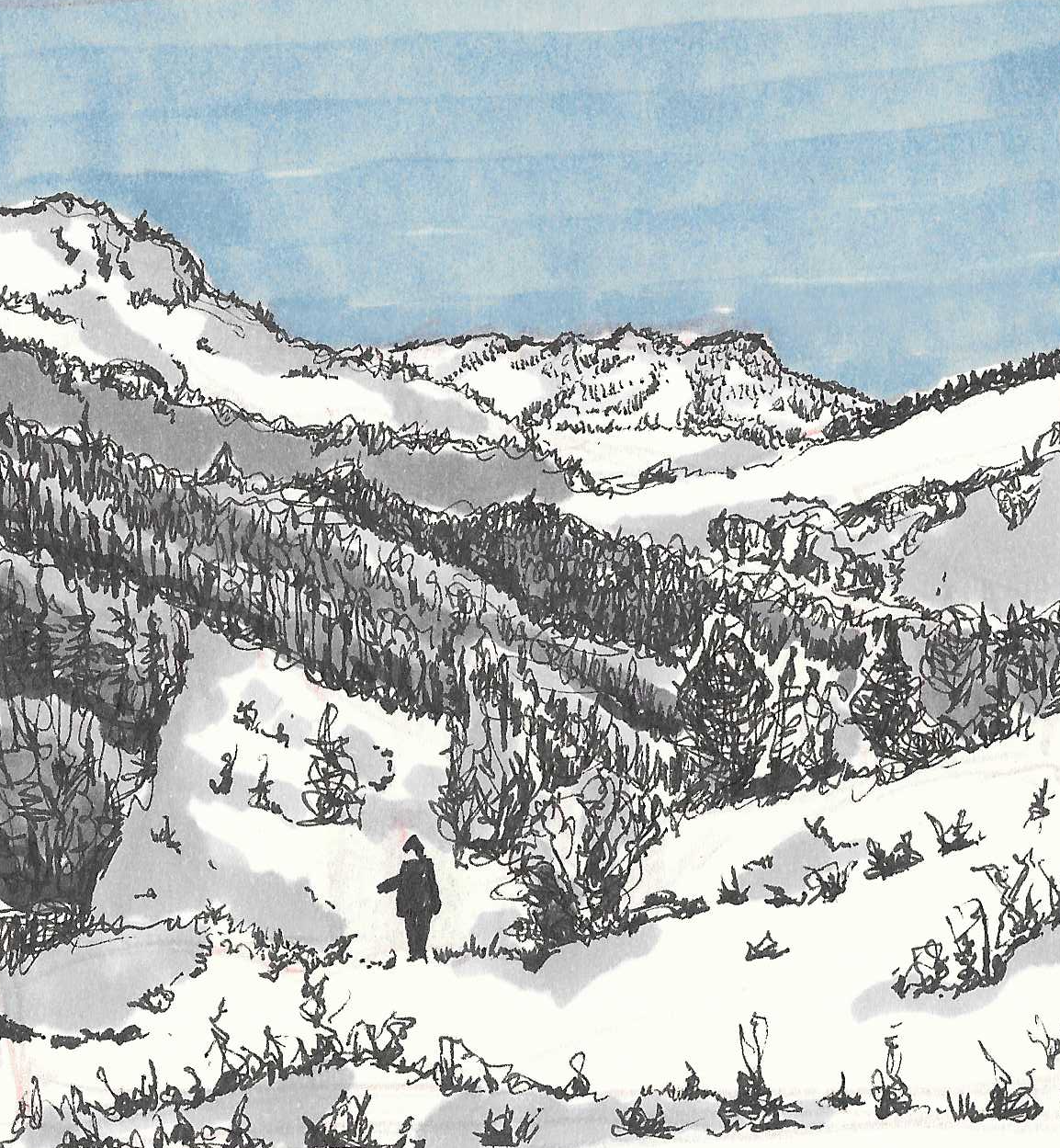 Dunkel sind die Tannenwälder, braun die Wiesen und mit Schneefeldern und Eis bedeckt.